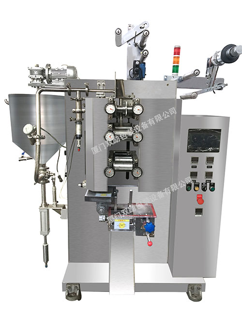 该机有一组纵封热辊筒、一组横封热辊筒、一组横封冷辊筒。封口采用辊筒方式,纵向封口花纹采用棋盘纹配合防漏线,被包装的物料通过计量装置落入包装袋中中,彻底解决液体渗漏夹丝难题。同时,为延长产品的保质期,可在包装物中填充惰性气体。